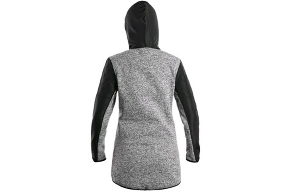 Dámská bunda z pleteniny, prodloužená, kombinace materiálů, kapuce napevno, zapínaní na zip, rukávy zakončeny gumičkou, 2 boční kapsy.