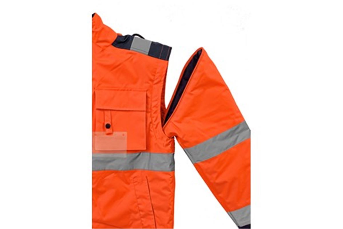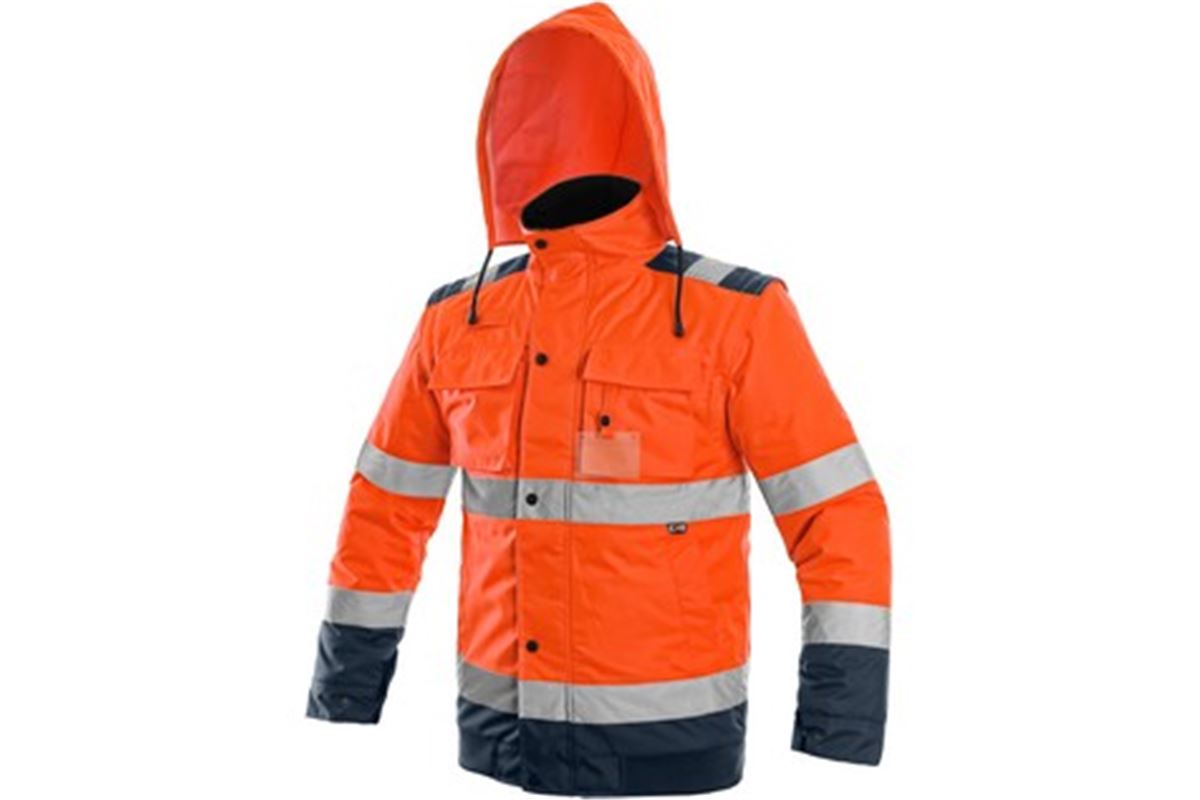 • Výstražná zateplená bunda do pasu, 2v1, odolná proti vodě a větru, reflexní pruhy, lepené švy, zapínaná na zip krytý legou, odepínací rukávy s regulovatelnými a vnitřními manžetami, kapuce v límci, fleecový vnitřní límec, v délce pružný pas, 2 spodní kapsy, dvě náprsní kapsy kryté patkou na suché zipy, na levé straně poutko na přichycení ID karty, na pravé straně smyčka na radiostanici, jedna vnitřní kapsa. Uvnitř je zip pro snadnou aplikaci výšivky na vnější straně bundy. Doporučené použití: stavebnictví, silničáři, řidiči, logistika, údržba, popeláři, záchranáři, v zimě a mokrém prostředí, dělníci.