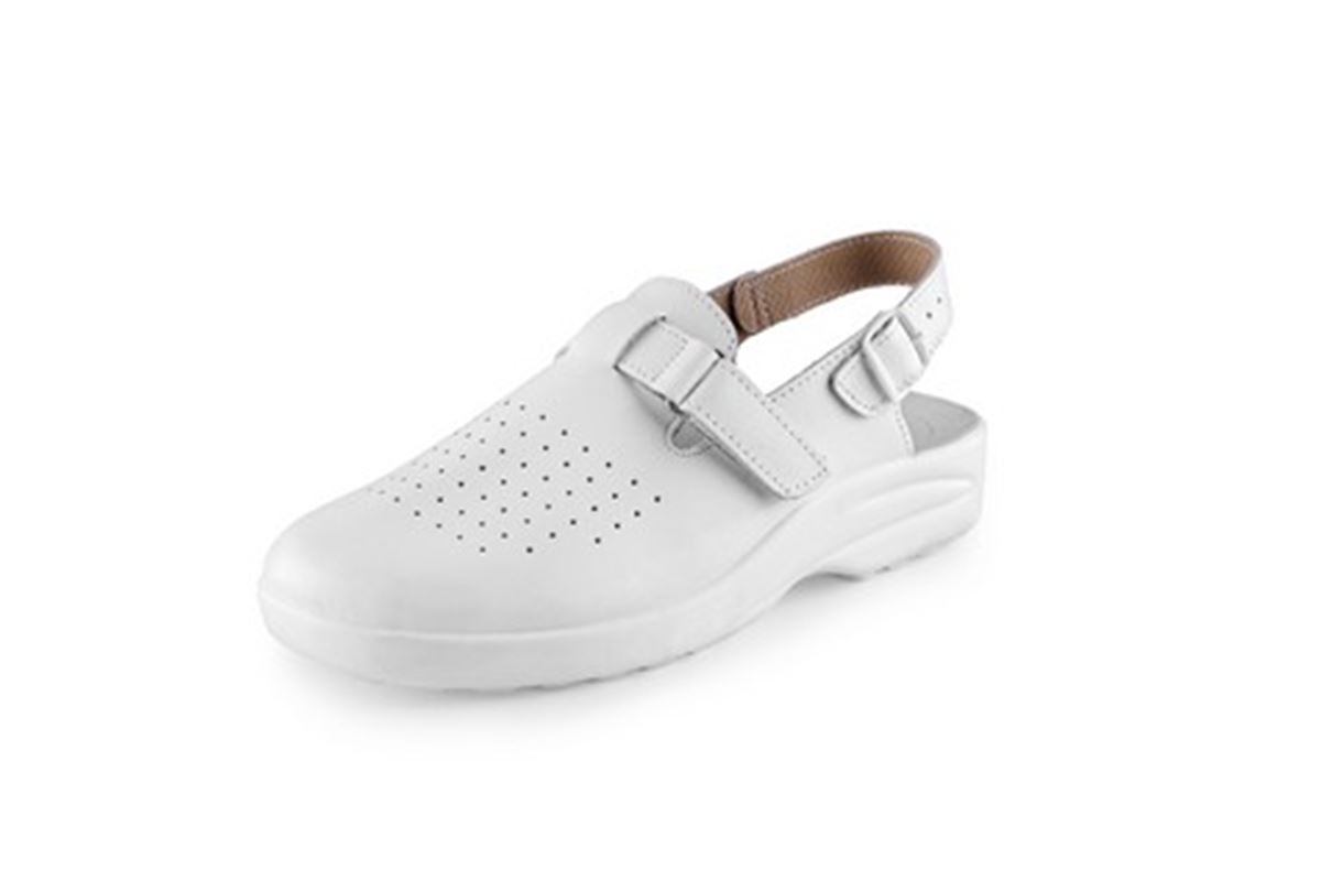 Sandál, kožený s plnou špicí, perforovaný s přezkou na suchý zip a páskem kolem paty.