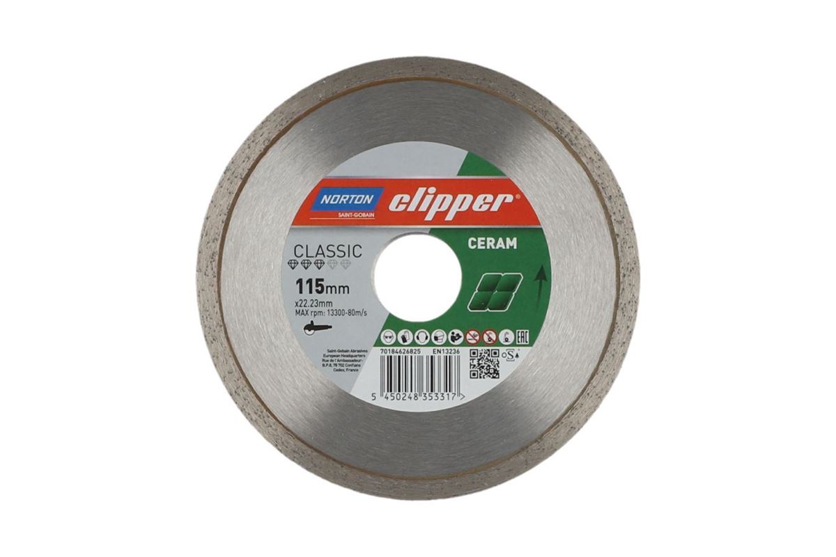 Diamantový kotouč na keramické a kamenné dlažby, žuly, mramoru CLIPPER CLA CERAM 1670 o průměru 115 mm. Určeno pro všechny typy keramických dlaždic, pálené dlaždice, žulu a mramorovou dlažbu.