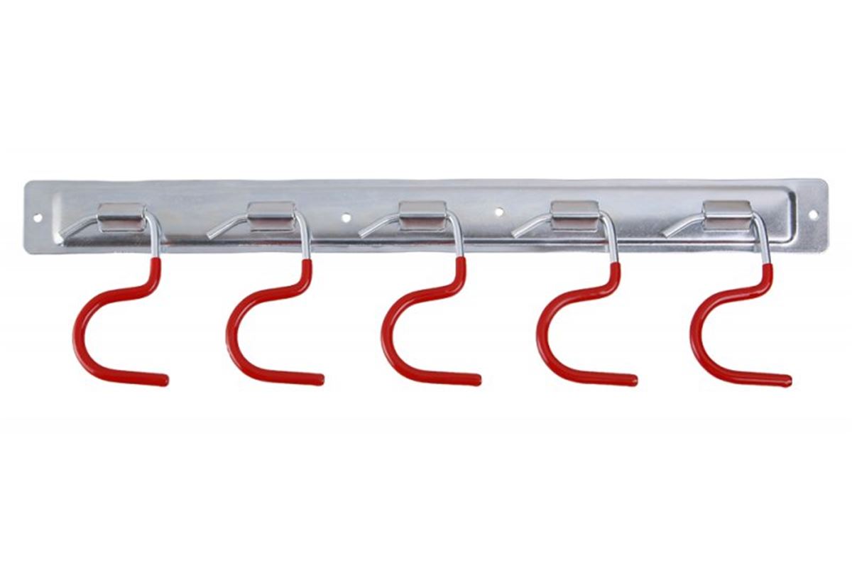 Praktický kovový držák zahradního nářadí na stěnu, 5 ks pohyblivých kovových háčků. Výhodou je velká skladovatelnost a přehlednost pověšeného zahradního nářadí, celková délka držáku : 450 mm.