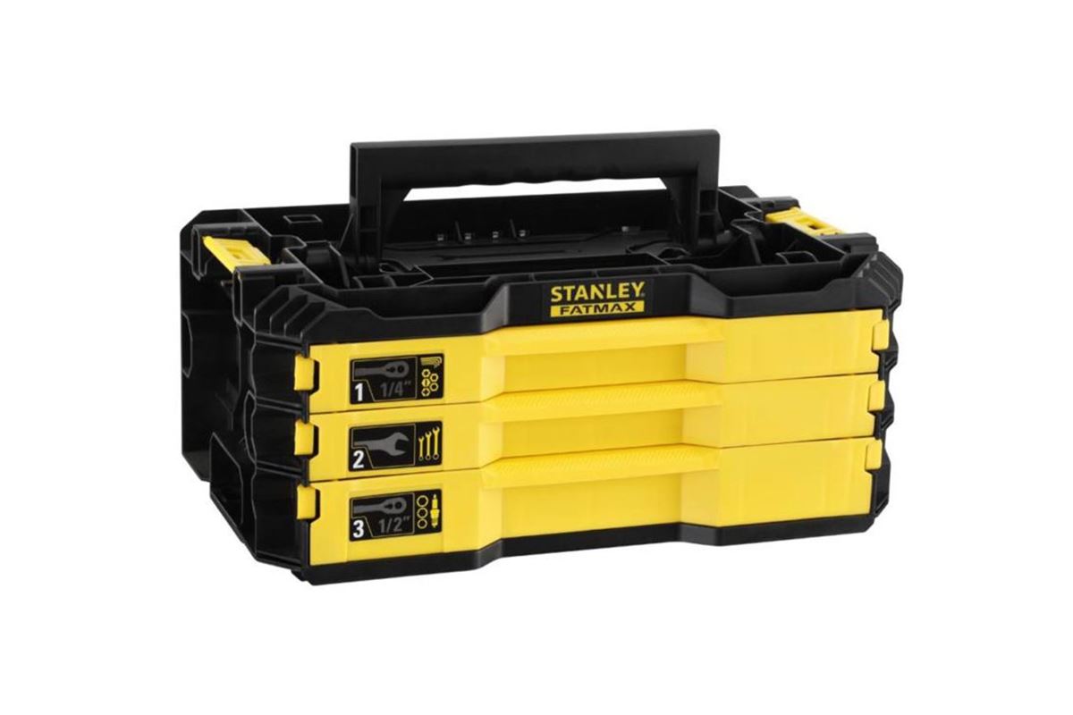 Gola sada v krabici se 3 zásuvkami Stanley se 126 kusy nářadí Možnost připojení TSTAK Skládací rukojeť - Odolné tvrdé zásuvky