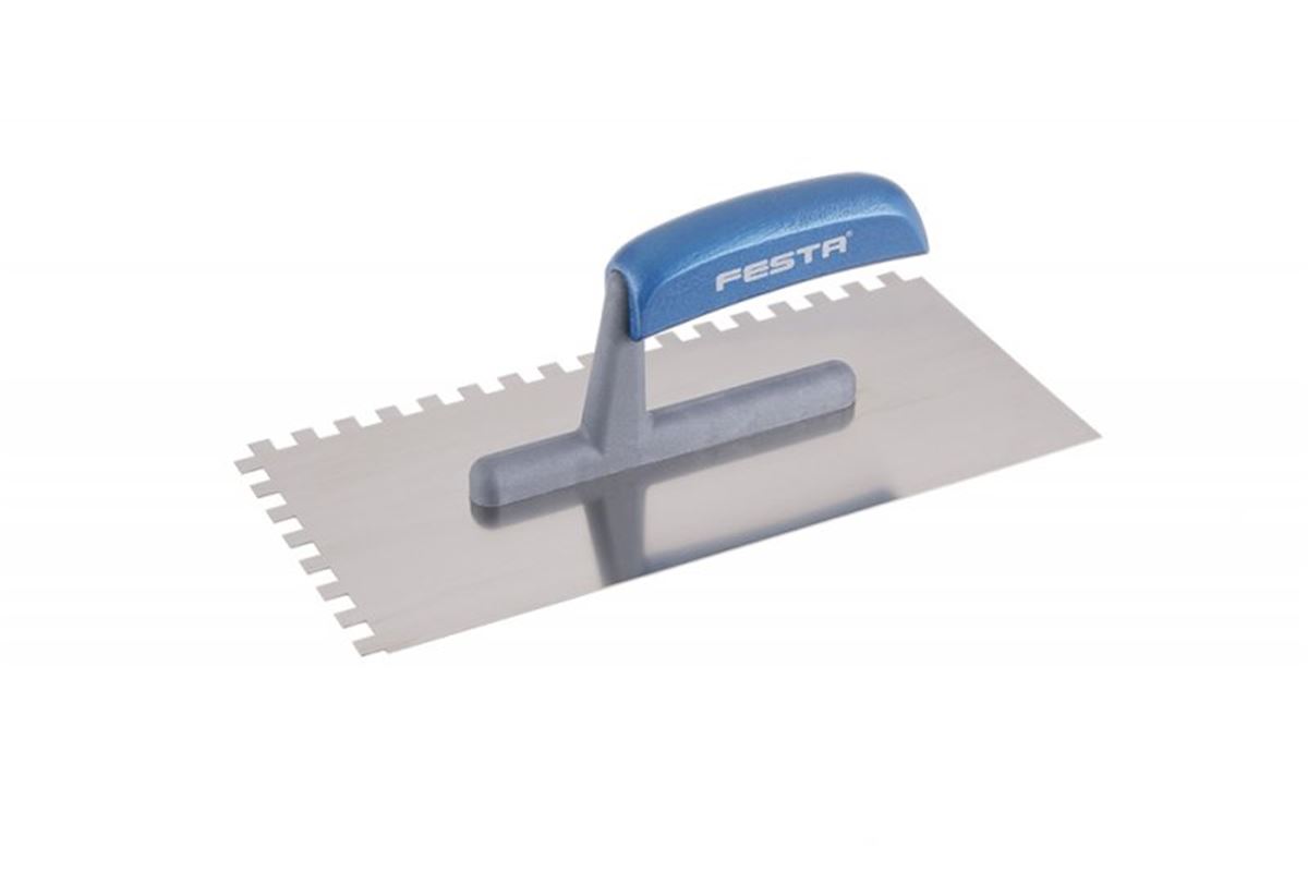 Hladítko nerezové zubové FESTA 280x130 mm, zub e8, s dřevěnou lakovanou ručkou, tl.plechu 0,8 mm. Používá se zejména k nanášení lepidel pod obklady a dlažby, dále pak k nanášení stěrek, štuků, omítek, tmelů a dalších stavebních hmot. Hladítko nerezové zubové umožní natáhnout lepidlo či stavební hmotu v pruzích a výšce dle zubu hladítka.