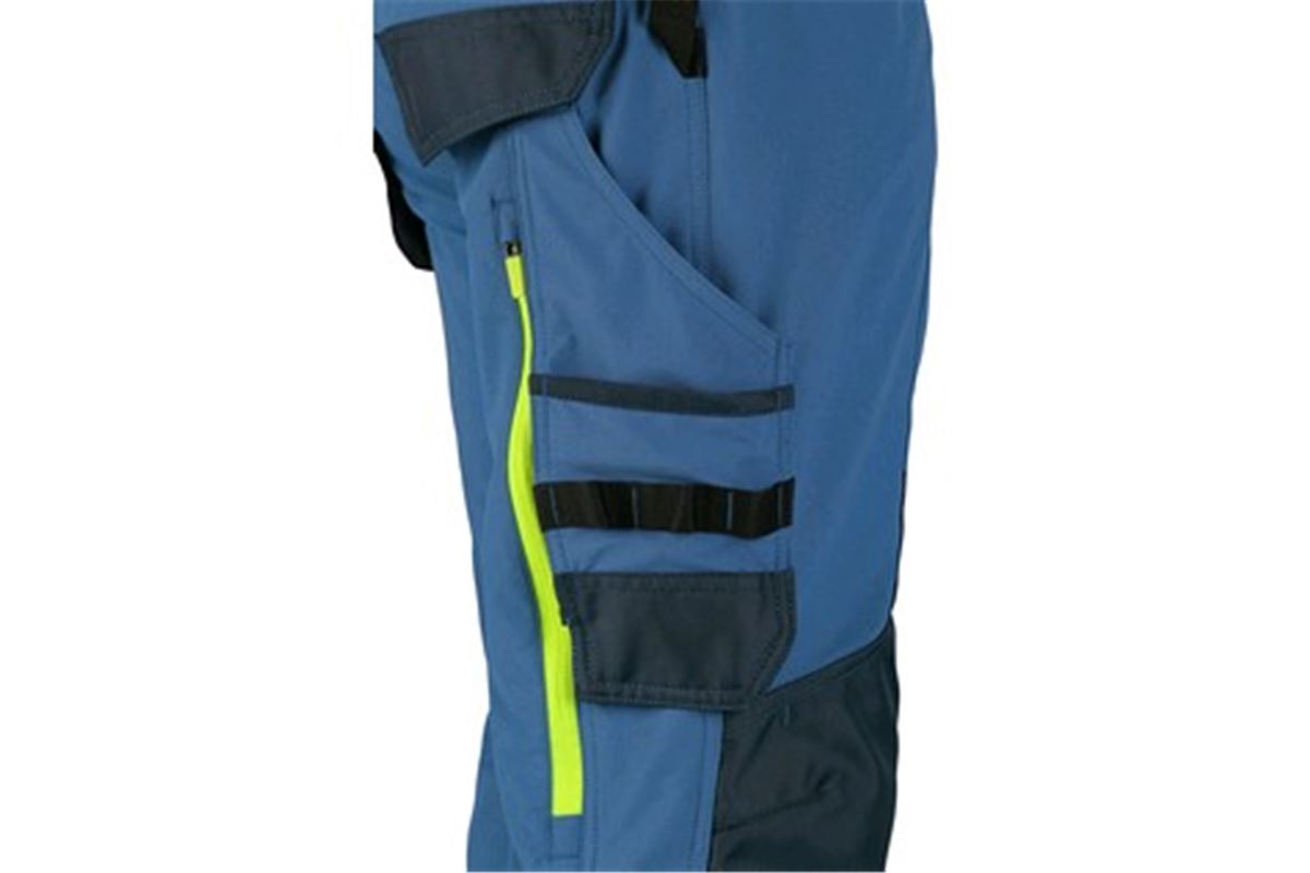 Pánské montérkové kalhoty s kontrastními barevnými a reflexními doplňky. Konstrukce 4-way stretch umožňuje roztahování materiálu ve všech čtyřech směrech a tím i snadný a volný pohyb. Vysoké procento nylonu zaručuje schopnost rychlého schnutí. Vybavení kalhot: flexibilní pas s možností upravení velikosti a poutky na opasek, 2 přední kapsy, 2 odnímatelné kapsy na nářadí vyztuženy materiálem CORDURA, kapsa na zip na stehně, multifunkční boční kapsa, 2 zadní kapsy ve spodní části vyztuženy materiálem CORDURA, zipová ventilace v zadní části stehen, kolena zesílena materiálem CORDURA s možností vložení kolenních výztuh, spodní část nohavic vyztužena materiálem CORDURA.