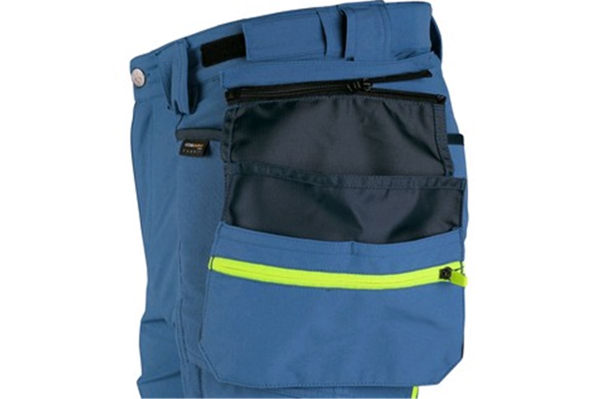 Pánské montérkové kalhoty s kontrastními barevnými a reflexními doplňky. Konstrukce 4-way stretch umožňuje roztahování materiálu ve všech čtyřech směrech a tím i snadný a volný pohyb. Vysoké procento nylonu zaručuje schopnost rychlého schnutí. Vybavení kalhot: flexibilní pas s možností upravení velikosti a poutky na opasek, 2 přední kapsy, 2 odnímatelné kapsy na nářadí vyztuženy materiálem CORDURA, kapsa na zip na stehně, multifunkční boční kapsa, 2 zadní kapsy ve spodní části vyztuženy materiálem CORDURA, zipová ventilace v zadní části stehen, kolena zesílena materiálem CORDURA s možností vložení kolenních výztuh, spodní část nohavic vyztužena materiálem CORDURA.