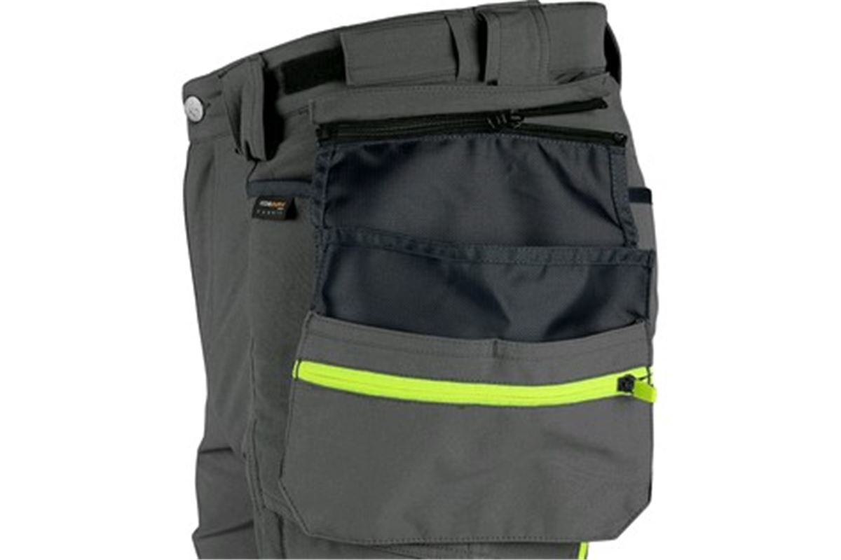 Pánské montérkové kalhoty s kontrastními barevnými a reflexními doplňky. Konstrukce 4-way stretch umožňuje roztahování materiálu ve všech čtyřech směrech a tím i snadný a volný pohyb. Vysoké procento nylonu zaručuje schopnost rychlého schnutí. Vybavení kalhot: flexibilní pas s možností upravení velikosti a poutky na opasek, 2 přední kapsy, 2 odnímatelné kapsy na nářadí vyztuženy materiálem CORDURA, kapsa na zip na stehně, multifunkční boční kapsa, 2 zadní kapsy ve spodní části vyztuženy materiálem CORDURA, zipová ventilace v zadní části stehen, kolena zesílena materiálem CORDURA s možností vložení kolenních výztuh, spodní část nohavic vyztužena materiálem CORDURA.