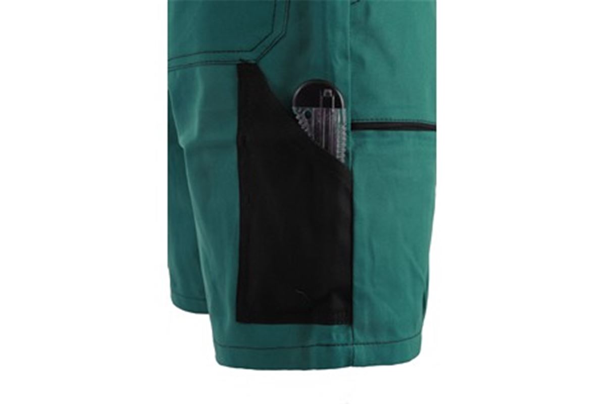 Pánské kraťasy, pevný pas vzadu do gumy s poutky na opasek, přední vakové kapsy, boční kapsy na metr a na mobil.