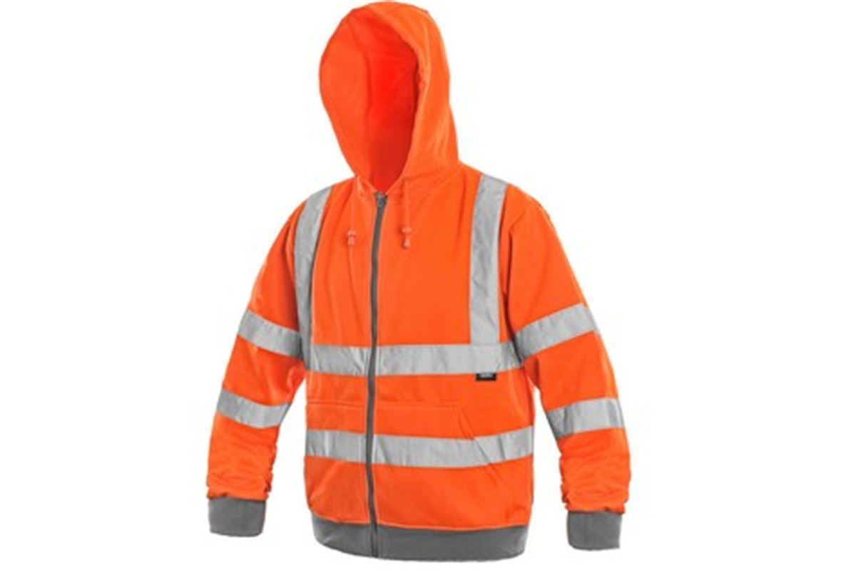 Výstražná mikina s reflexními pruhy a kapucí, zapínání na zip, hlavicové rukávy, pas a rukávy ukončeny pružnou manžetou, dvě spodní kapsy.