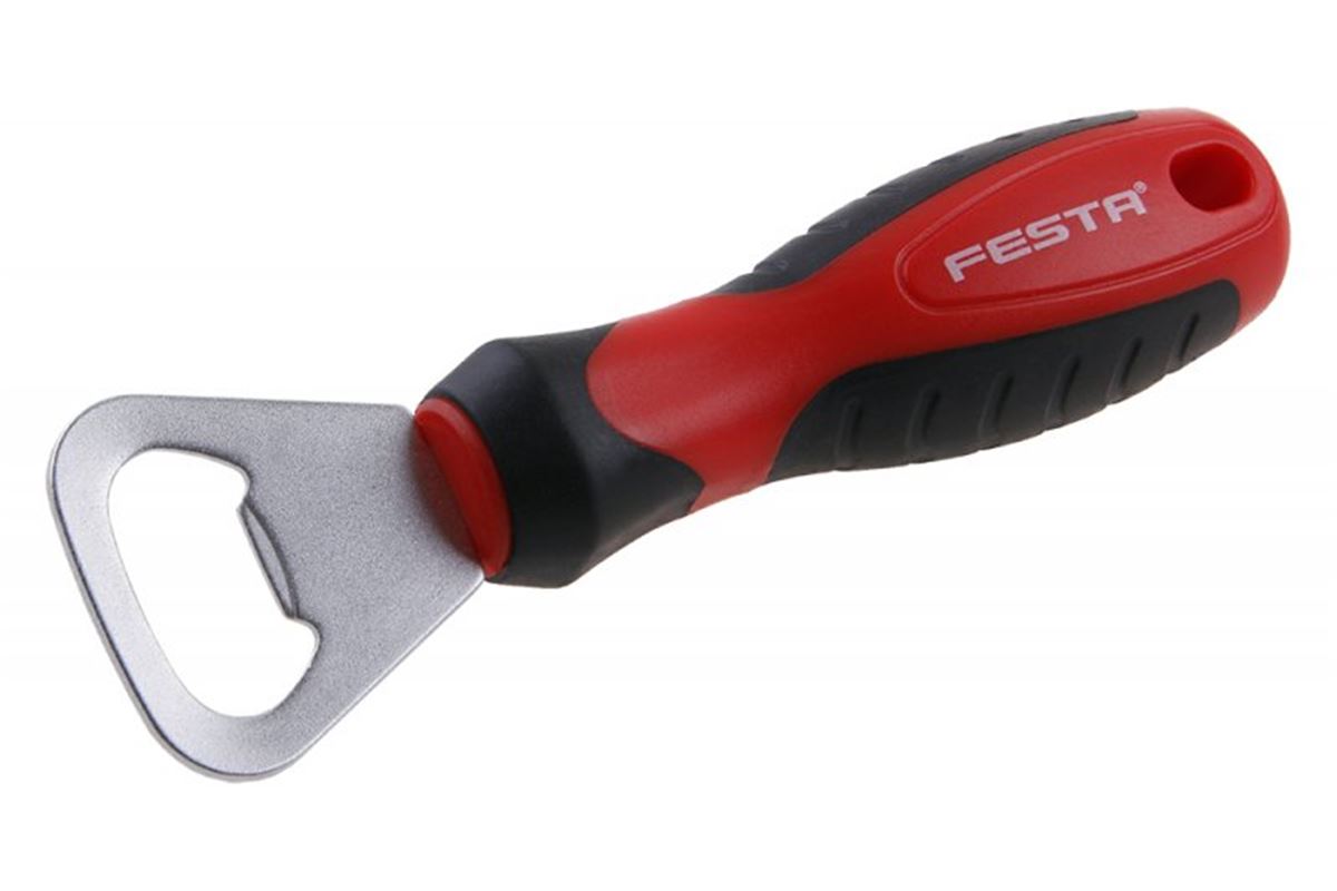 Stylový kovový otvírák na lahve v designu šroubováku, ergonomická dvoukomponentní měkčená rukojeť.