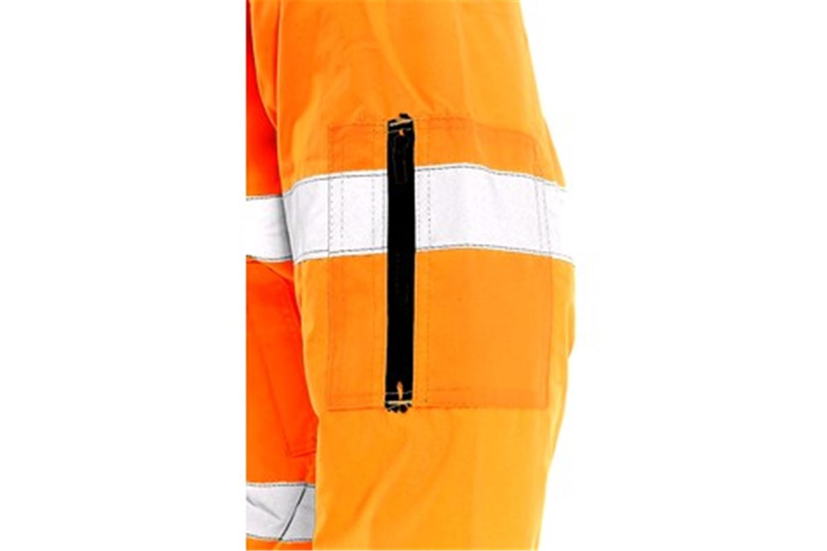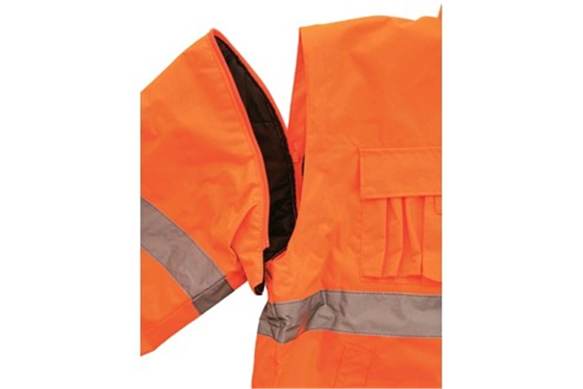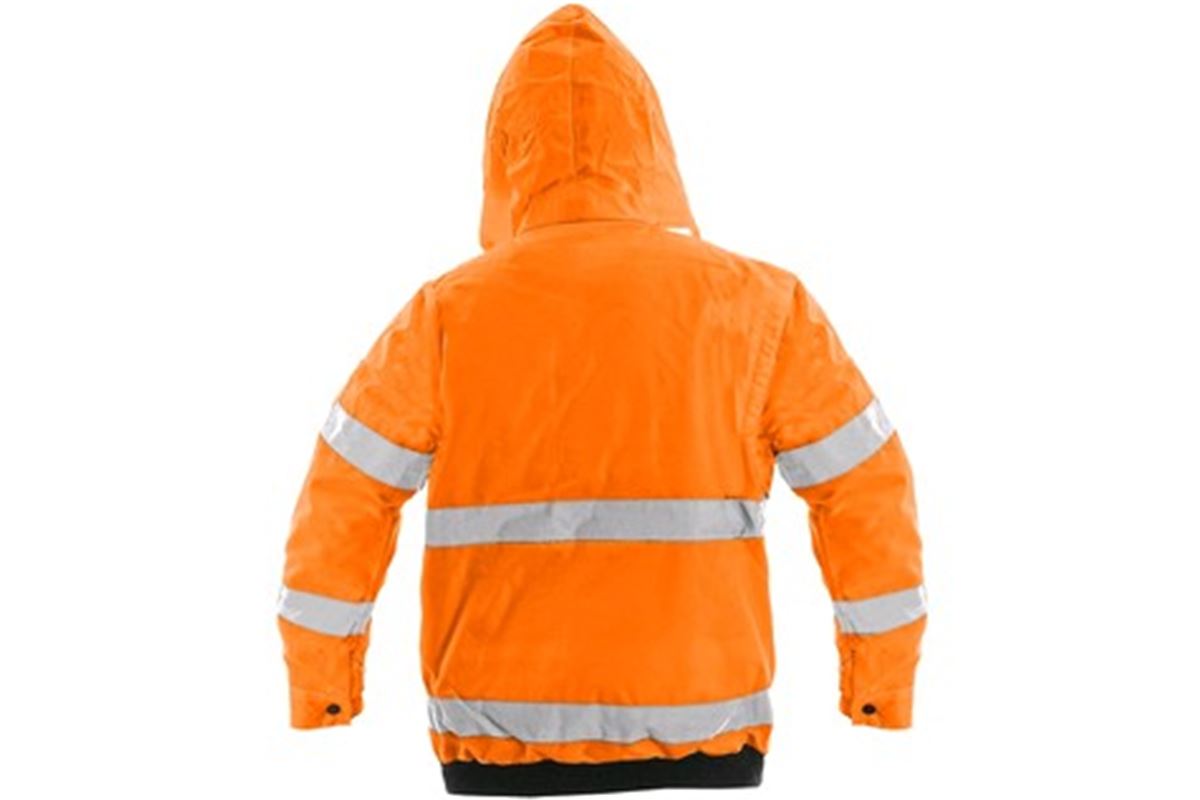 Výstražná bunda, zateplená, 2 v 1, do pasu, odolná proti vodě, odepínací rukávy, kapuce v límci, elastický spodní lem, lepené švy.