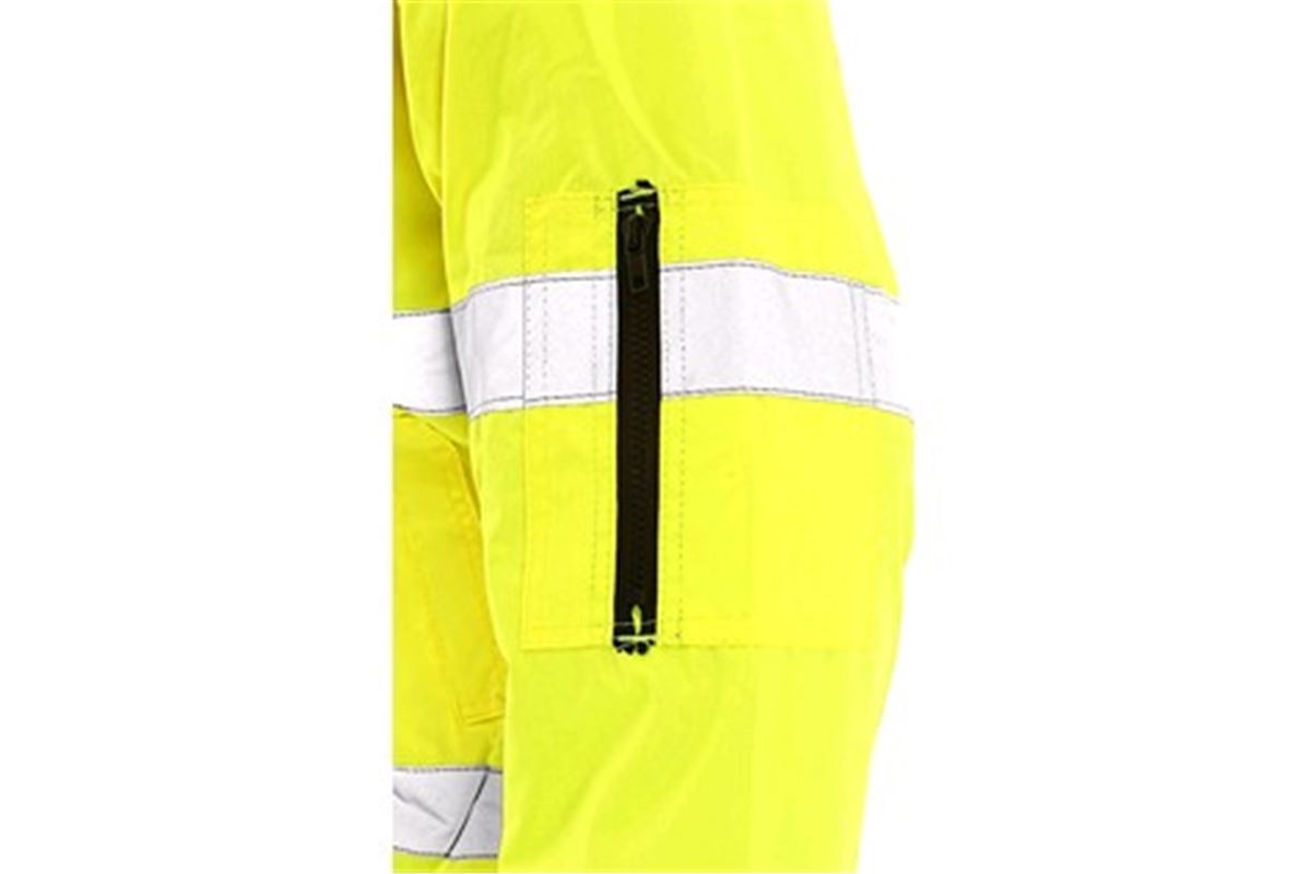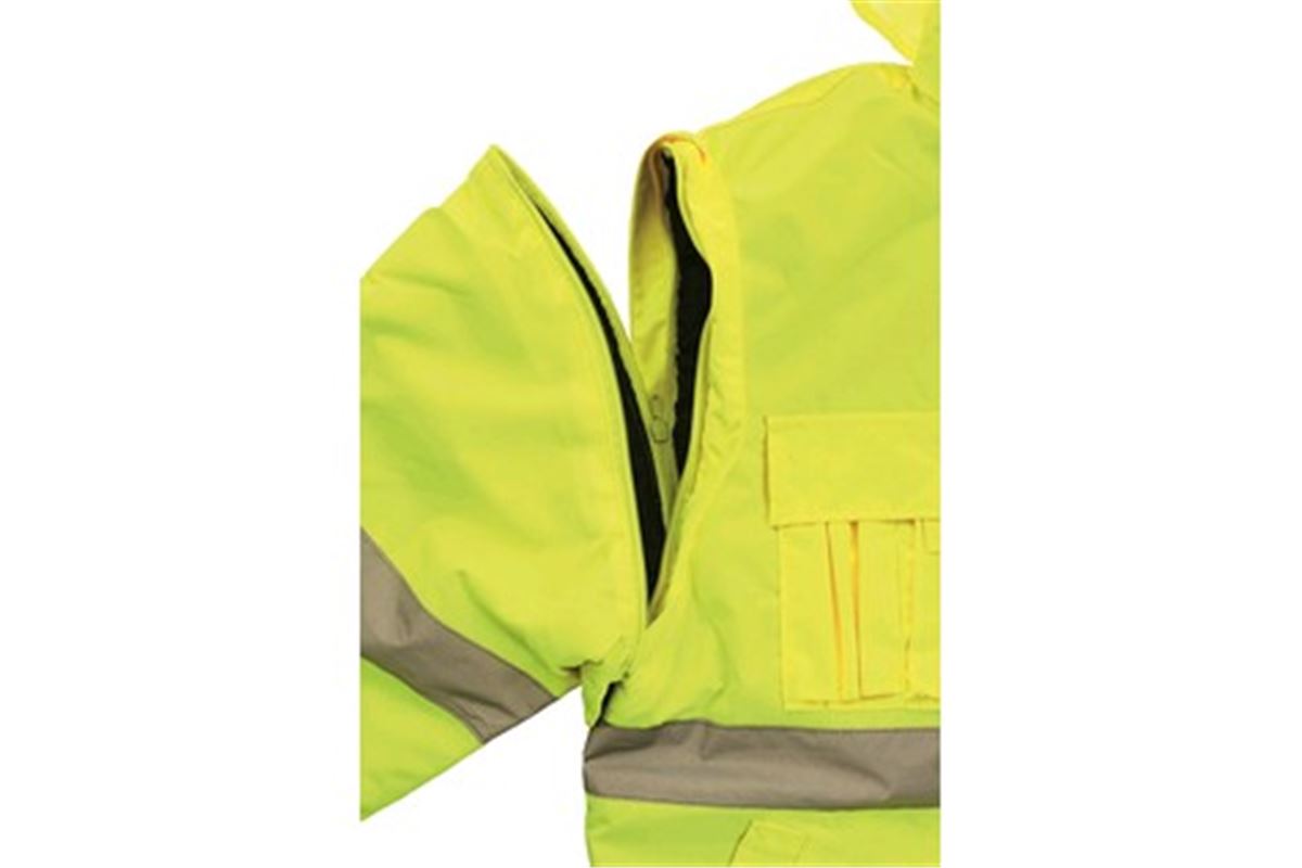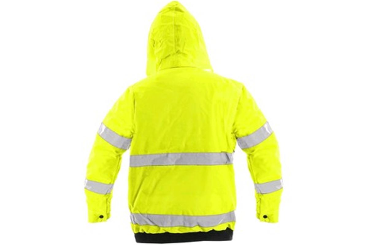 Výstražná bunda, zateplená, 2 v 1, do pasu, odolná proti vodě, odepínací rukávy, kapuce v límci, elastický spodní lem, lepené švy.