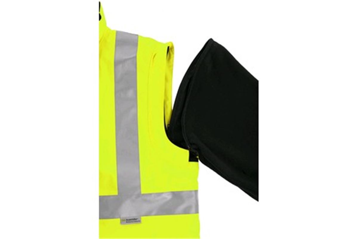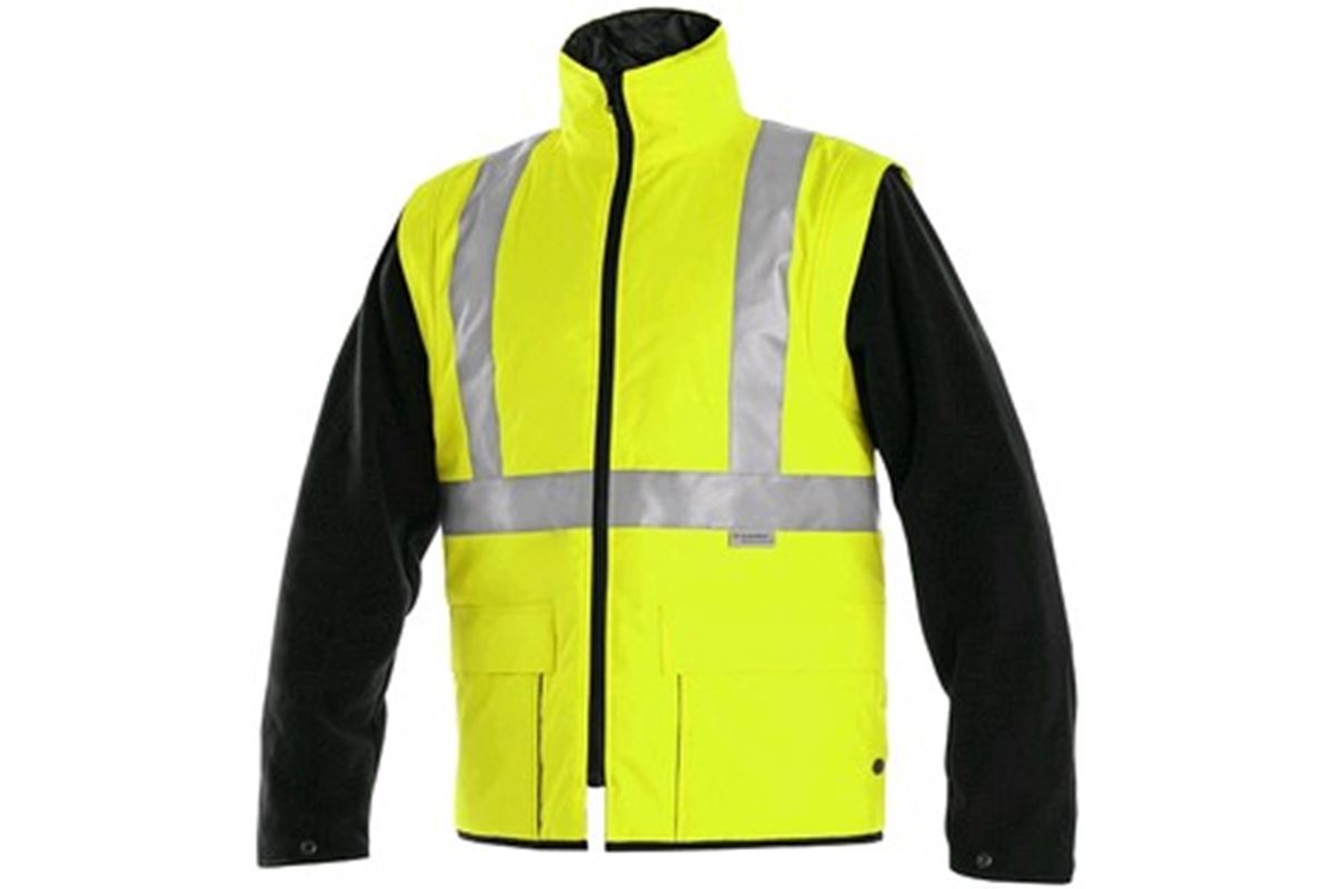 • Pánská výstražná bunda 5 v 1 s odnímatelnou vnitřní bundou, odolná proti vodě a větru, 3M reflexní pruhy, lepené švy. Vnější bunda: 2 spodní kapsy s patkou, 2 náprsní kapsy, zip krytý légou zapínanou na druky, kapuce v límci, regulovatelné manžety na suchý zip. Možnost regulace velikosti v pase i v dolní části bundy. Vnitřní kapsy: na pravé straně kapsa na mobil, na levé straně větší kapsa na peněženku. Vnitřní bunda s odepínacími fleecovými rukávy, 2 boční kapsy kryté patkou na suchý zip, vnitřní kapsa na levé straně. Doporučené použití: stavebnictví, silničáři, řidiči, logistika, údržba, policie, záchranáři.