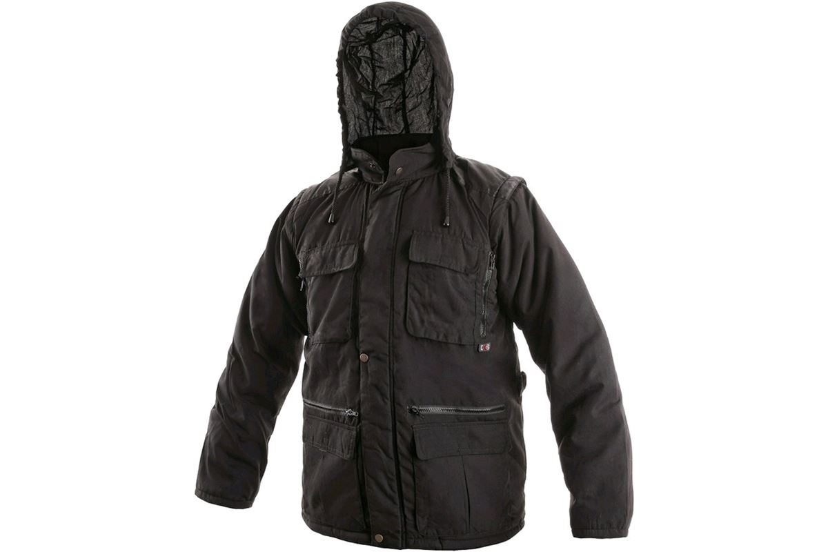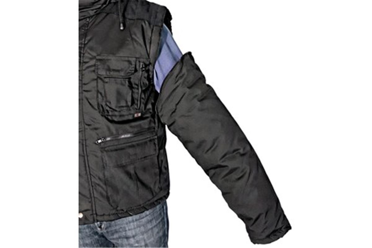 Zateplená bunda, kapuce v límci, zesílená ramena, odepínací rukávy s pružnou manžetou, stahování v dolním okraji, 14 kapes.
