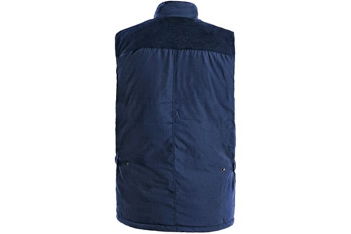 Zateplená vesta, ramena a límec pošitý manšestrem, pružné stažení průramku, možnost stažení vesty v pase, 14 kapes - z toho 3 kapsy uvnitř vesty.