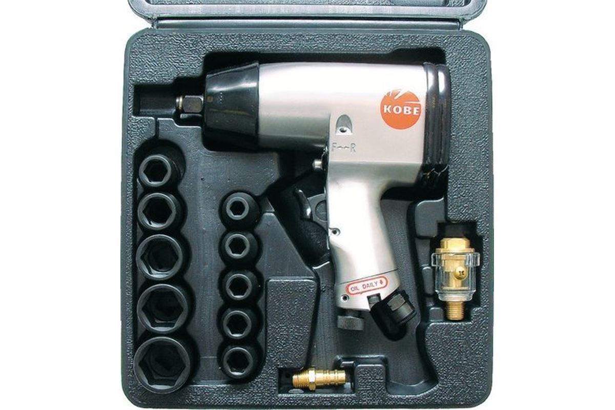 možností přepnutí směr chodu pomocí reverzačního tlačítka, velikostí čtyčhranu 1/2", to vše v sadě a odolném plastovém pouzdře. KOBE IWS500 vzduchový utahovák