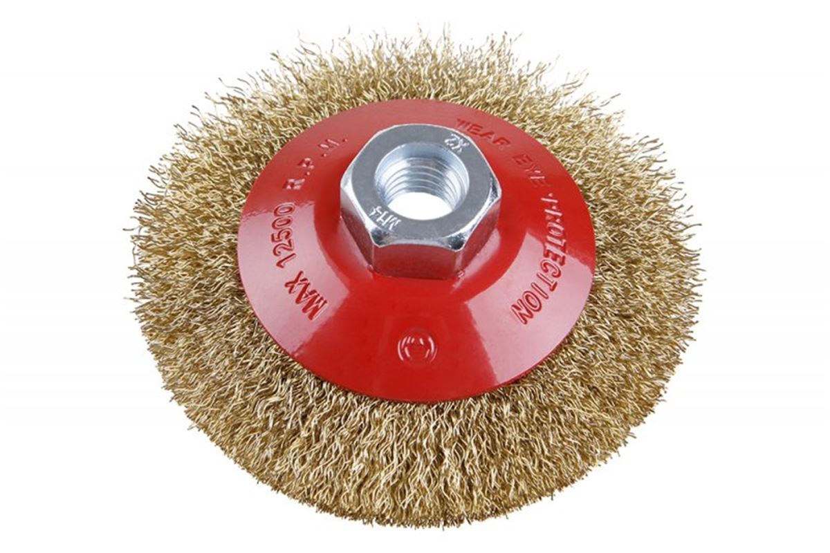 Rotační kartáč - miskový, kartáč FESTA zaručují kvalitní použité materiály i zpracování, vlnitý drát - pomosazený 0,3mm, průměr 100mm, uchycení M14*2, počet drátů 1800, maximální otáčky za min. 12500, použití : pro odstranění rzi, barvy, leštění .