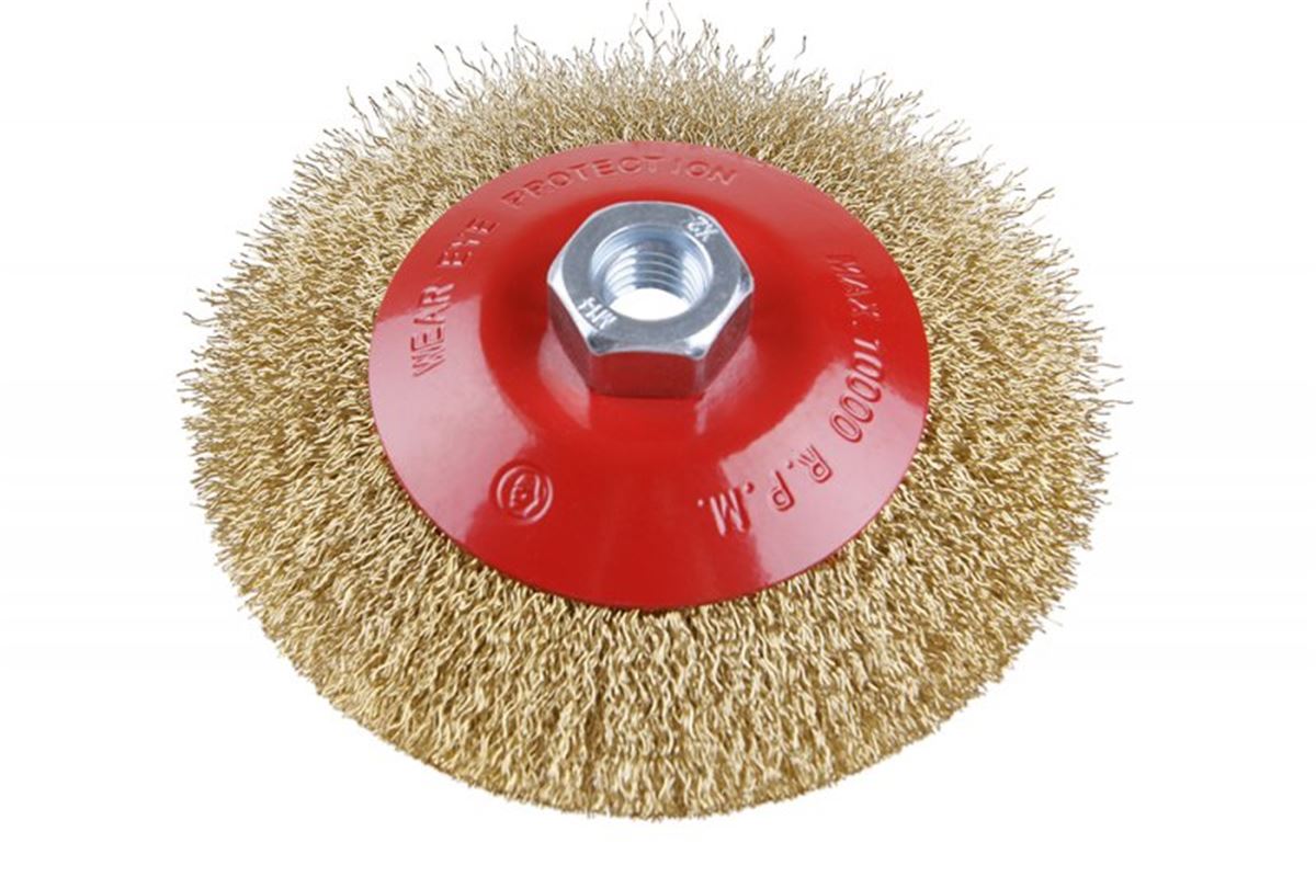 Rotační kartáč - miskový, kartáč FESTA zaručují kvalitní použité materiály i zpracování, vlnitý drát - pomosazený 0,3mm, průměr 100mm, uchycení M14*2, počet drátů 1800, maximální otáčky za min. 12500, použití : pro odstranění rzi, barvy, leštění .