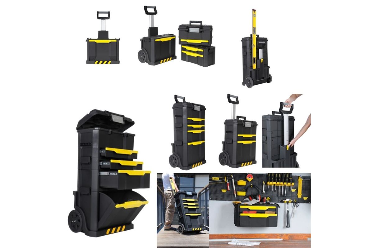 Pojízdný rozkládací box na nářadí Stanley 1-79-206 Rolling workshop. Možnost samostatně přenášet box i zásuvky. Odolný, uzamykatelný, pojízdný s hliníkovou teleskopickou rukojetí a rozměry 86,6 x 48,8 x 34,8 cm.