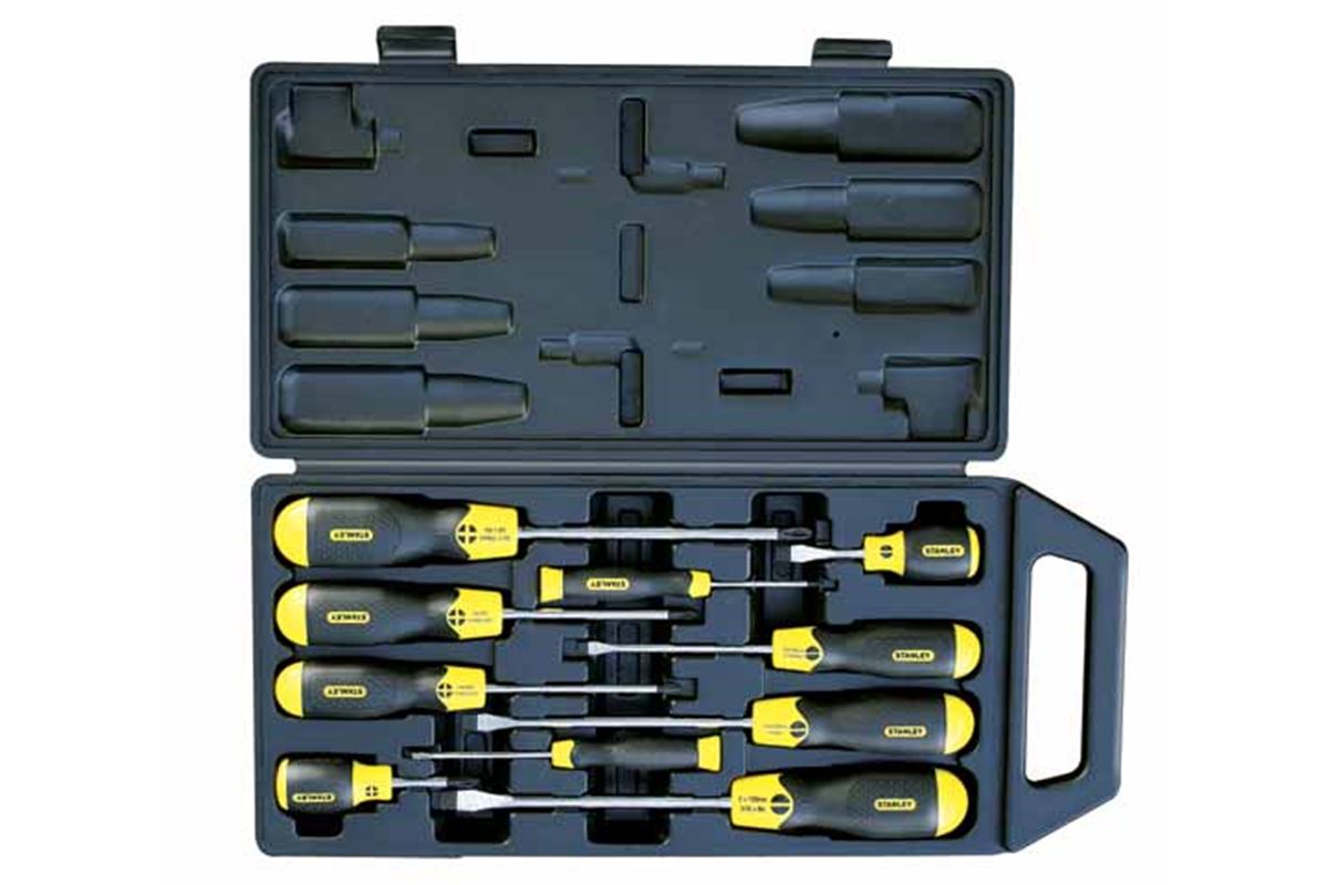 Velmi kvalitní 10dílná sada šroubováků CushionGrip,STANLEY.Šroubováky lze také uložit v kufříku zavěšeném na stěnu.