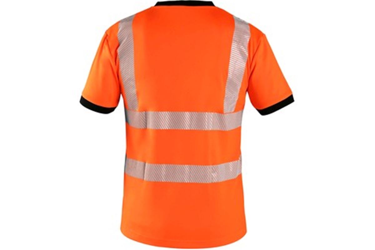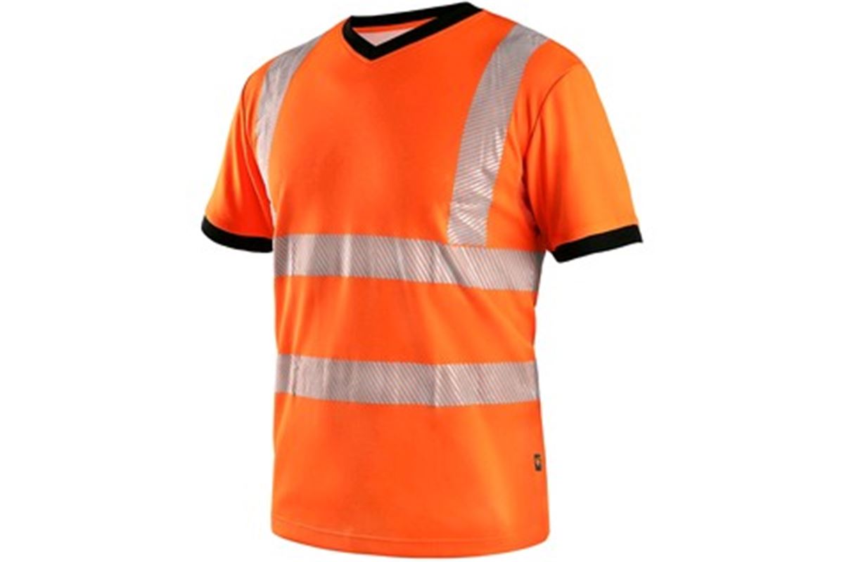 Výstražné tričko s krátkým rukávem, průkrčník do V, segmentované reflexní pruhy: 2 horizontální, 2 vertikální (šíře 5 cm).