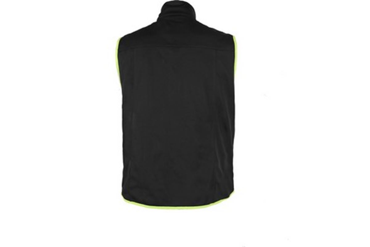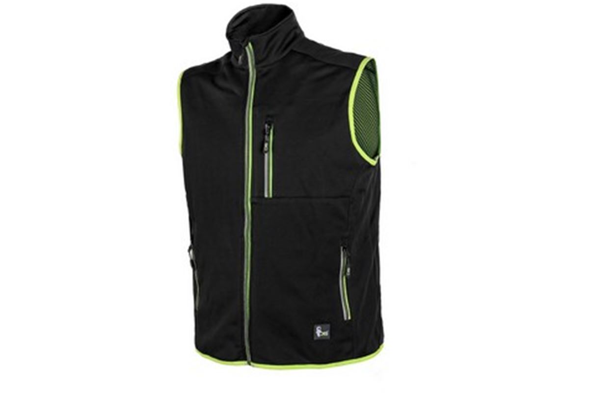 Lehká softshellová propínací vesta s reflexními výpustky, bez TPU, spodní lem do gumičky, 3 venkovní kapsy na zip a 3 vnitřní kapsy, dvoubarevné zipy.