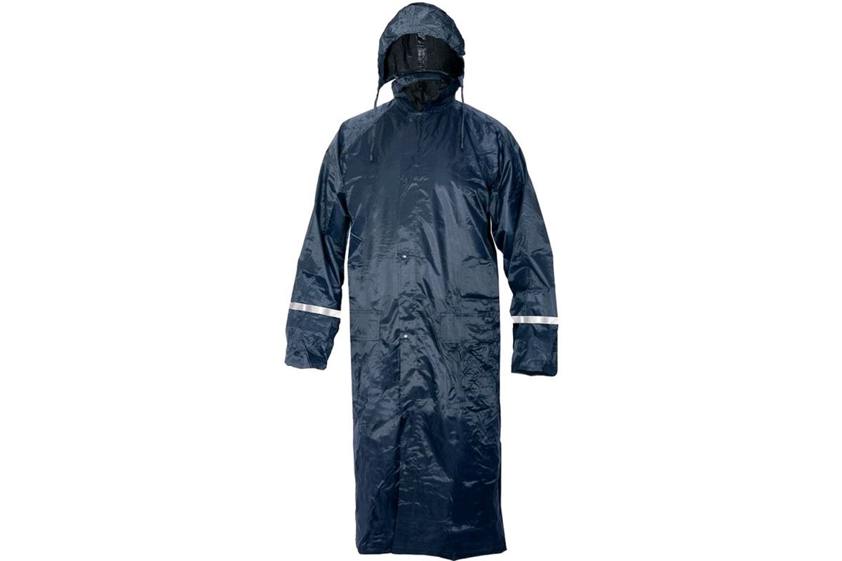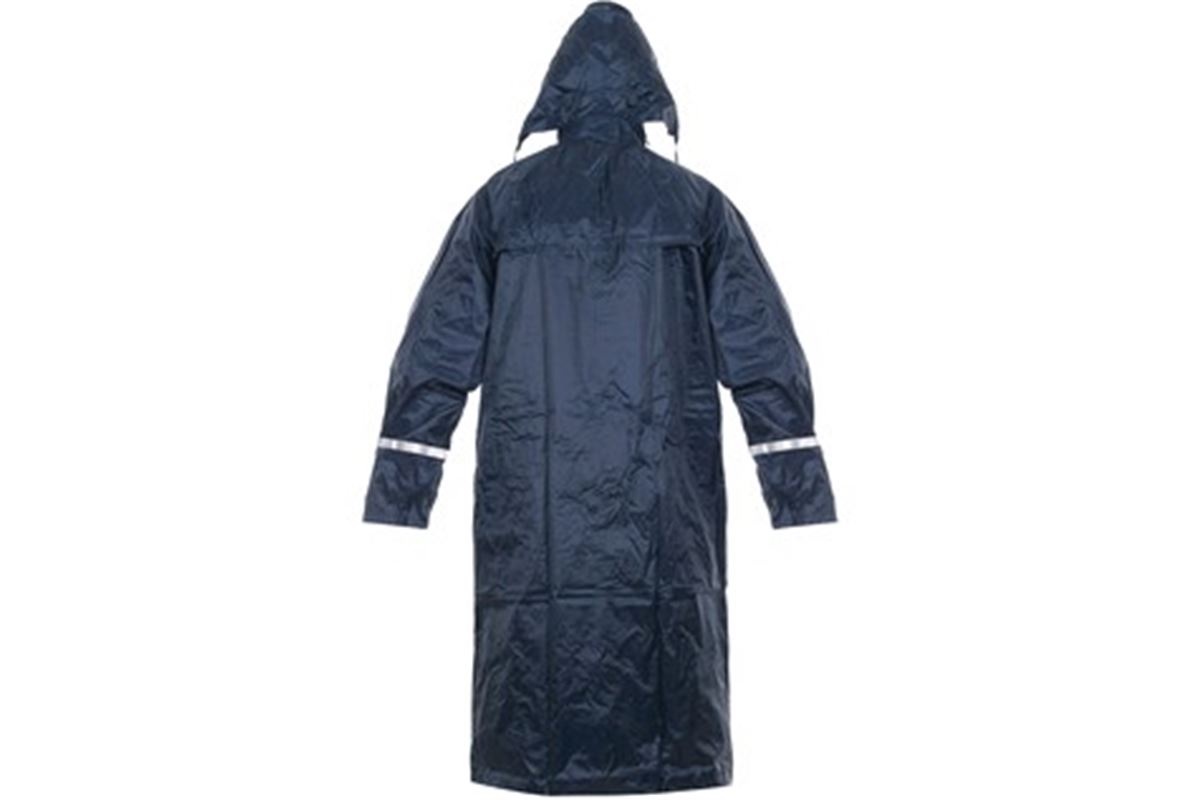Nepromokavý plášť do deště s kapucí v límci a reflexními doplňky, nižší hmotnost. Zapínání na zip i druky, vnitřní manžety v rukávech do gumy, větrání na zádech a v podpaží, lepené švy. Praktické balení na zip.