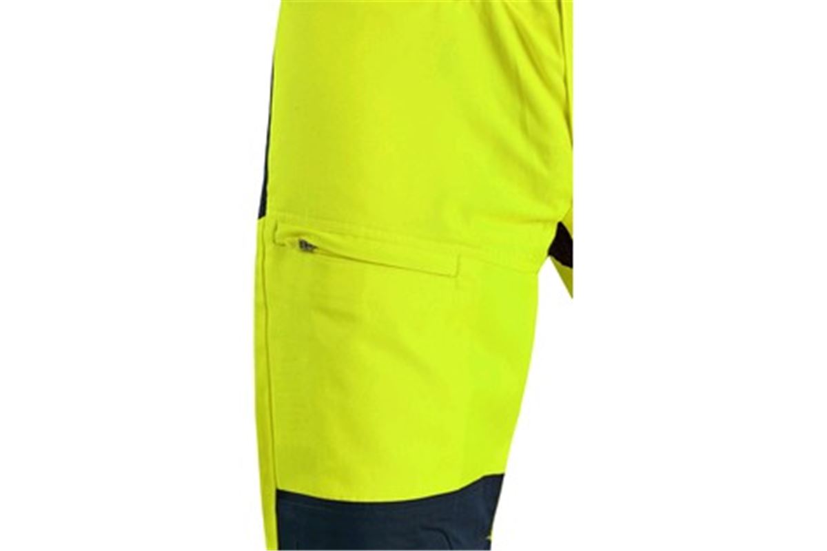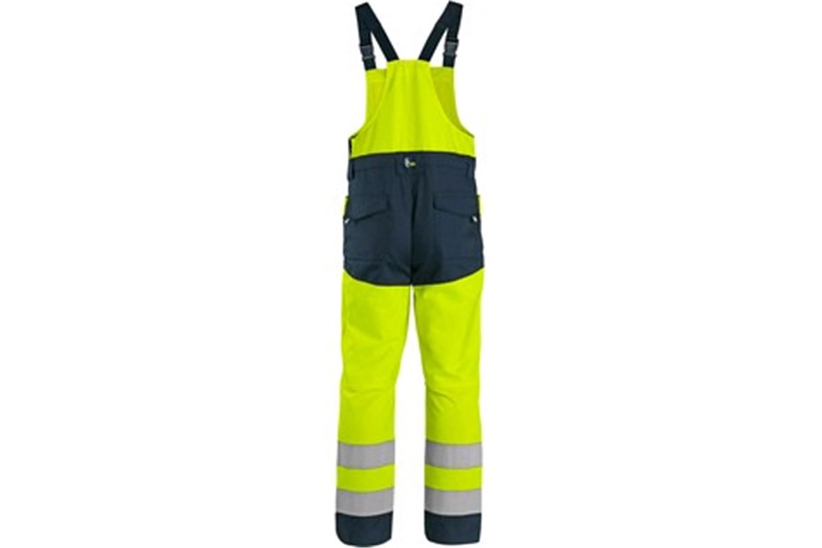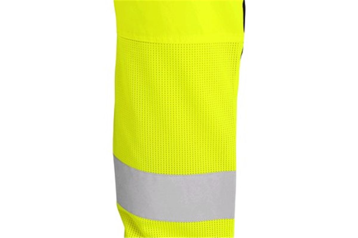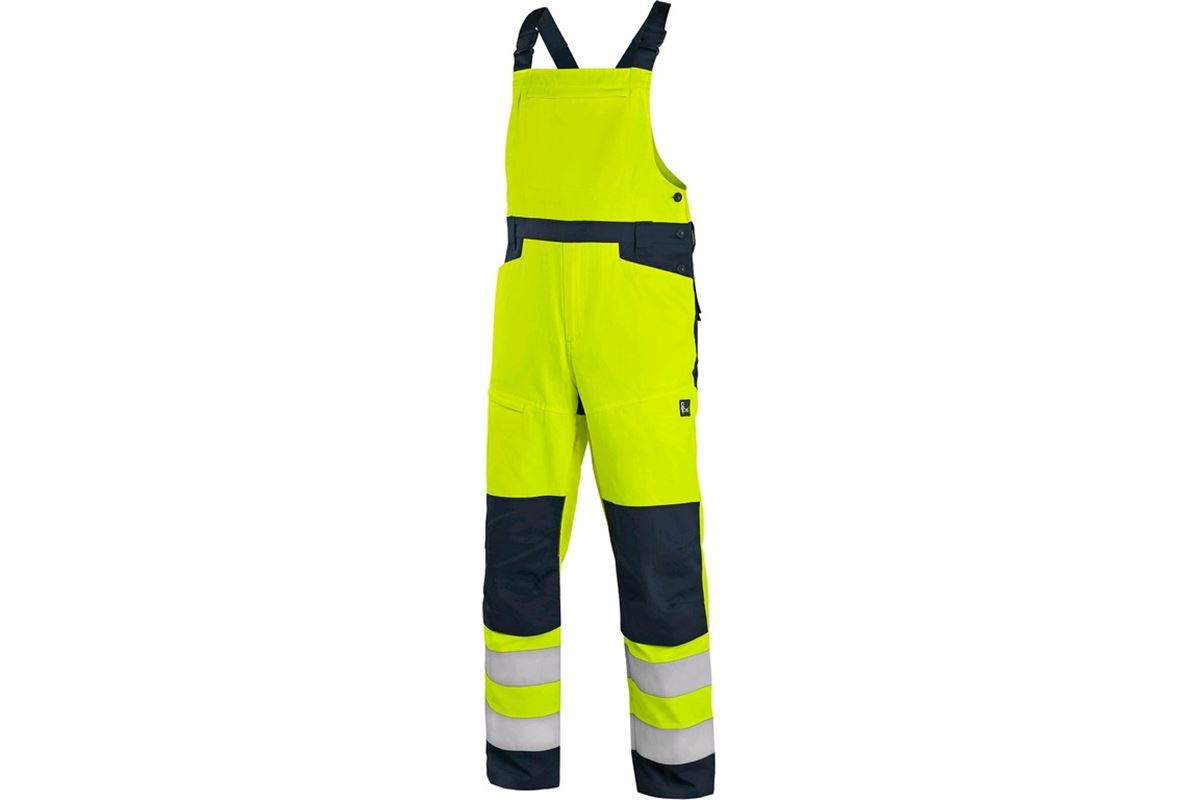 Pánské výstražné kalhoty s náprsenkou, letní, šle s gumou vzadu, náprsní kapsa na zip, boční zapínání na knoflíky, kryté přední zapínání na zip, 2 přední kapsy, 2 zadní kapsy s klopou na suchý zip, pravá boční kapsa na zip, zdvojená kolena s možností vložení kolenních výztuh, v zadní kolenní části mesh materiál zajišťující lepší odvětrávání, reflexní pásky (šíře 7 cm). V kombinaci s blůzou Halifax splňují ochrannou kategorii 3 (norma EN ISO 20471).