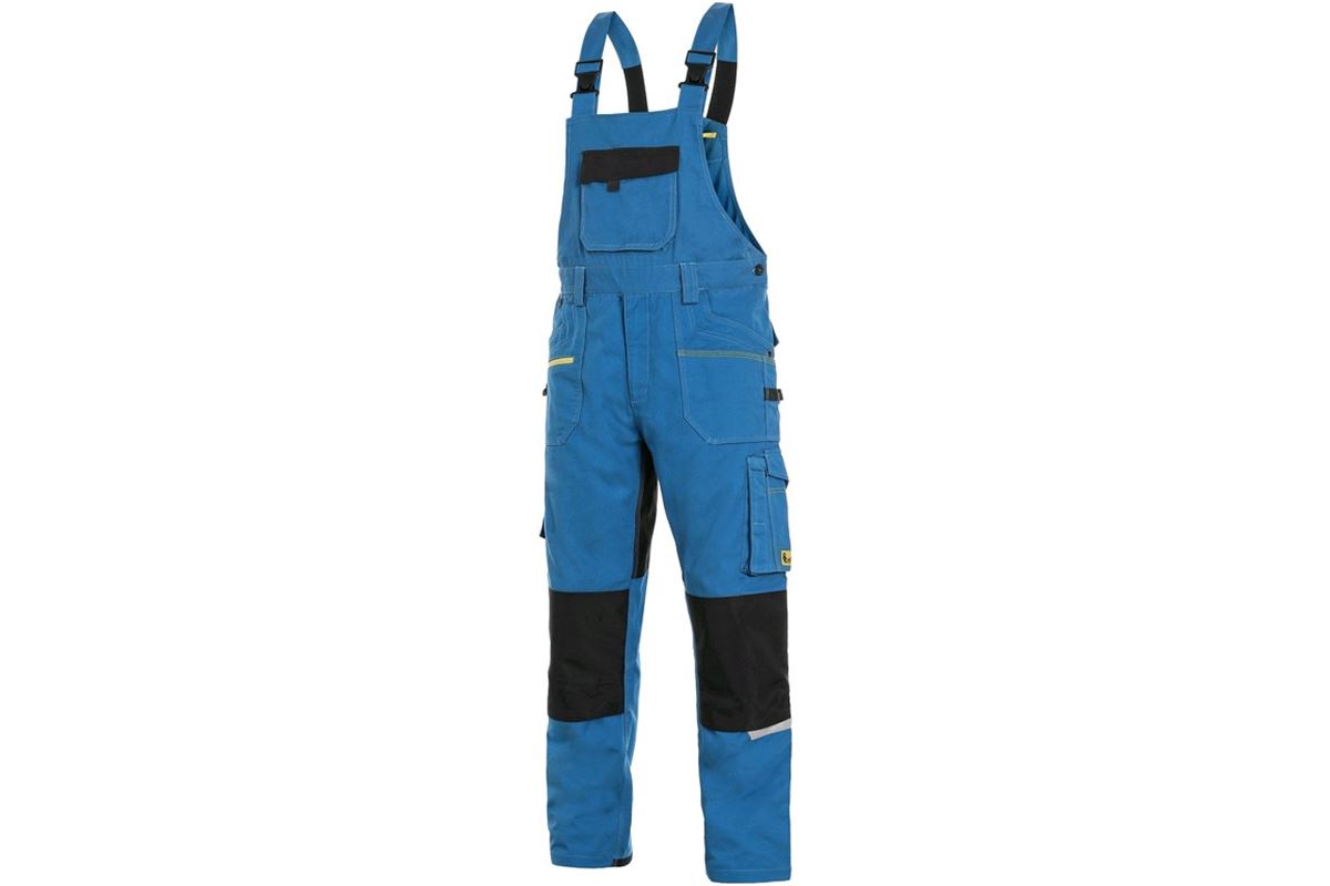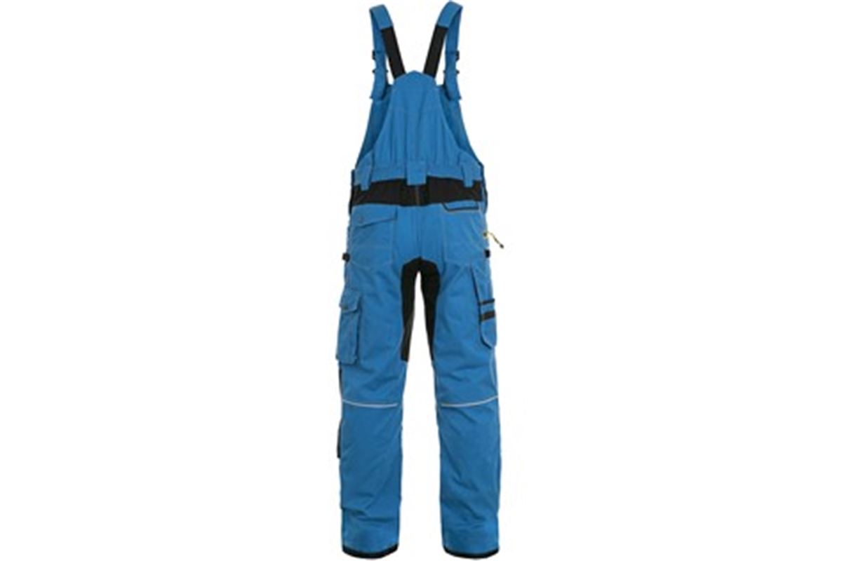 Pánské montérkové kalhoty s náprsenkou - zkrácená varianta na výšku 170-176 cm. Strečová tkanina umožňující volný pohyb, náprsní kapsa s klopou, pas s poutky na opasek, přední kapsy s kapsou na zip, multifunkční kapsy na obou stranách, kolena zesílena 600D polyesterem s možností vložení kolenních výztuh, dvě zadní kapsy - jedna s klopou, zadní spodní lem nohavice vyztužen 600D polyesterem, šle s gumou vzadu, reflexní doplňky.