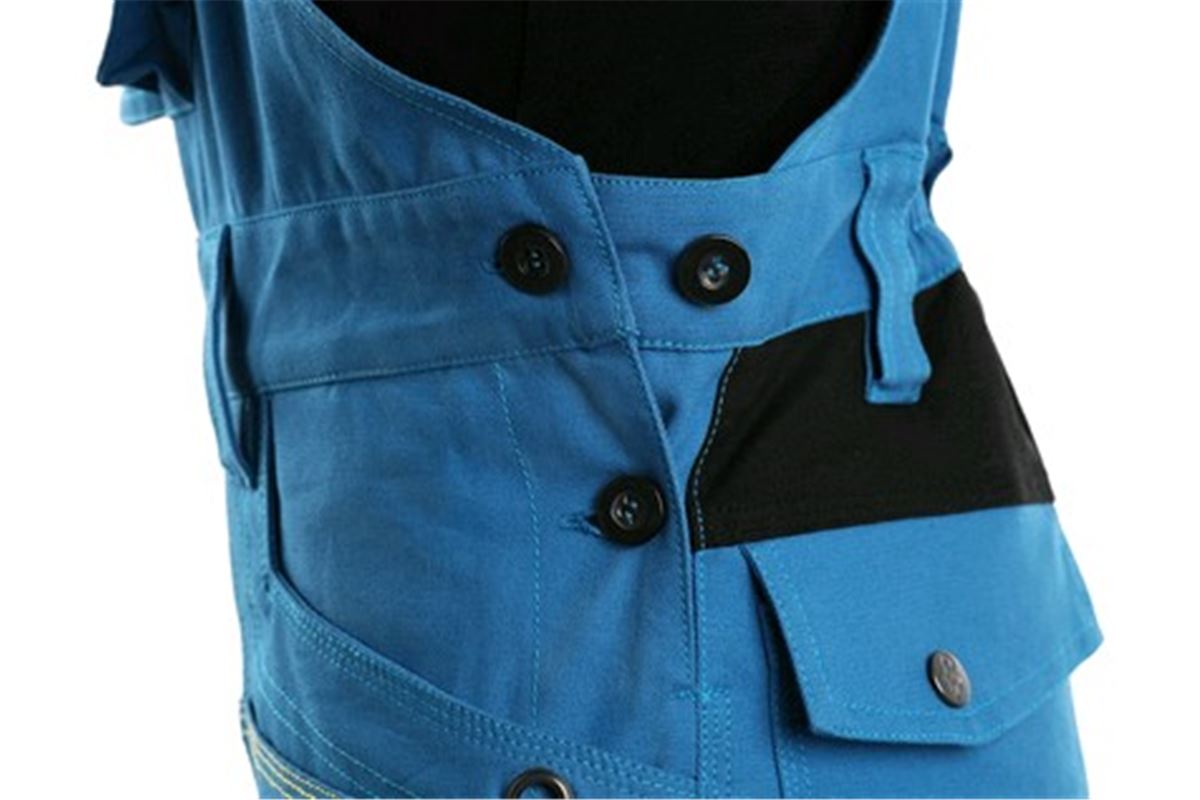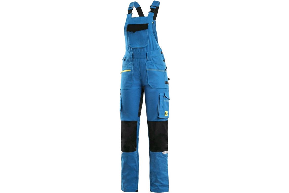 Dámské montérkové kalhoty s náprsenkou, strečová tkanina umožňující volný pohyb, náprsní kapsa s klopou, pas s poutky na opasek, přední kapsy s kapsou na zip, multifunkční kapsy na obou stranách, kolena zesílena 600D polyesterem, dvě zadní kapsy - jedna s klopou, zadní spodní lem nohavice vyztužen 600D polyesterem, šle s gumou vzadu, reflexní doplňky.