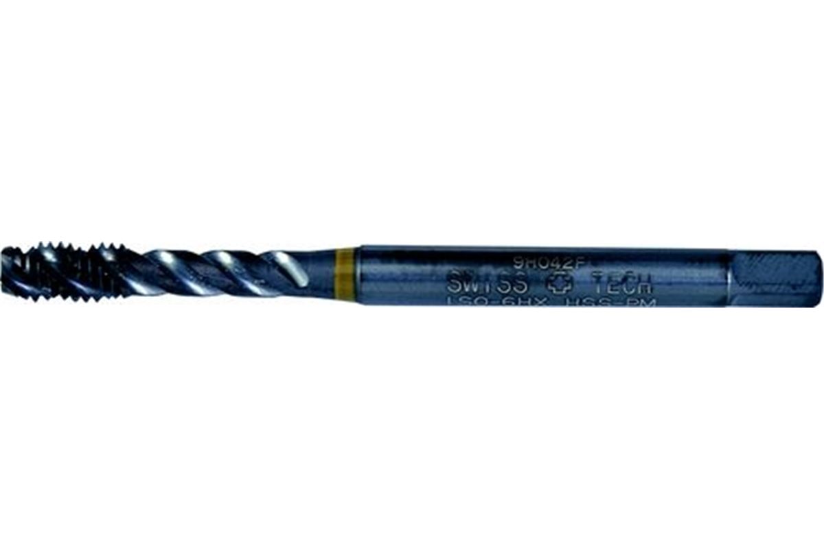 Závitník strojní M10 x 1,5 HSS-PM SWISS TECH pro slepé otvory. Šroubovitá drážka, nitridovaný a oxidovaný. Oranžový pruh. Vhodný pro obtížně obrob. titanové slitiny; obtížně obrob. žáruvzdorné super slitiny na bázi železa, kobaltu nebo niklu.